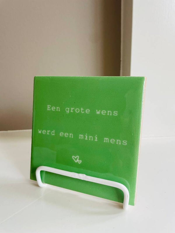 Tegel groen met tekst " Een grote wens werd een mini mens"