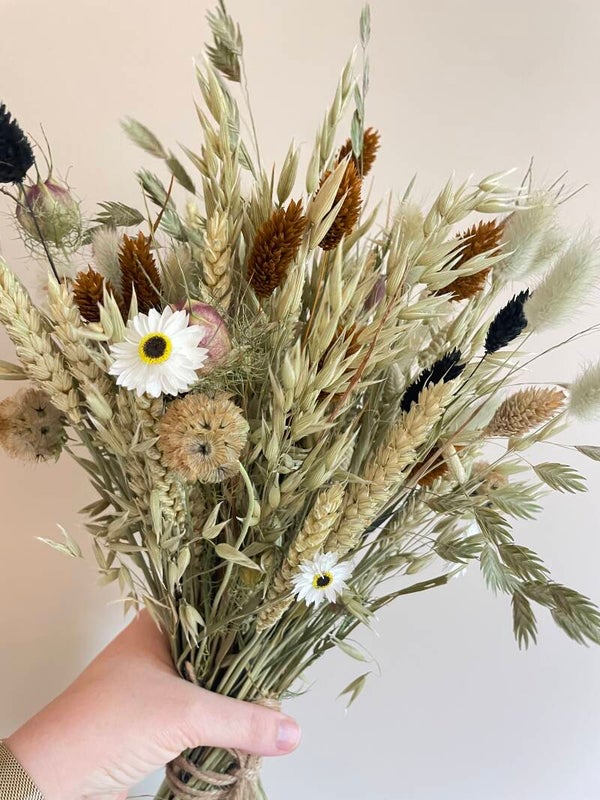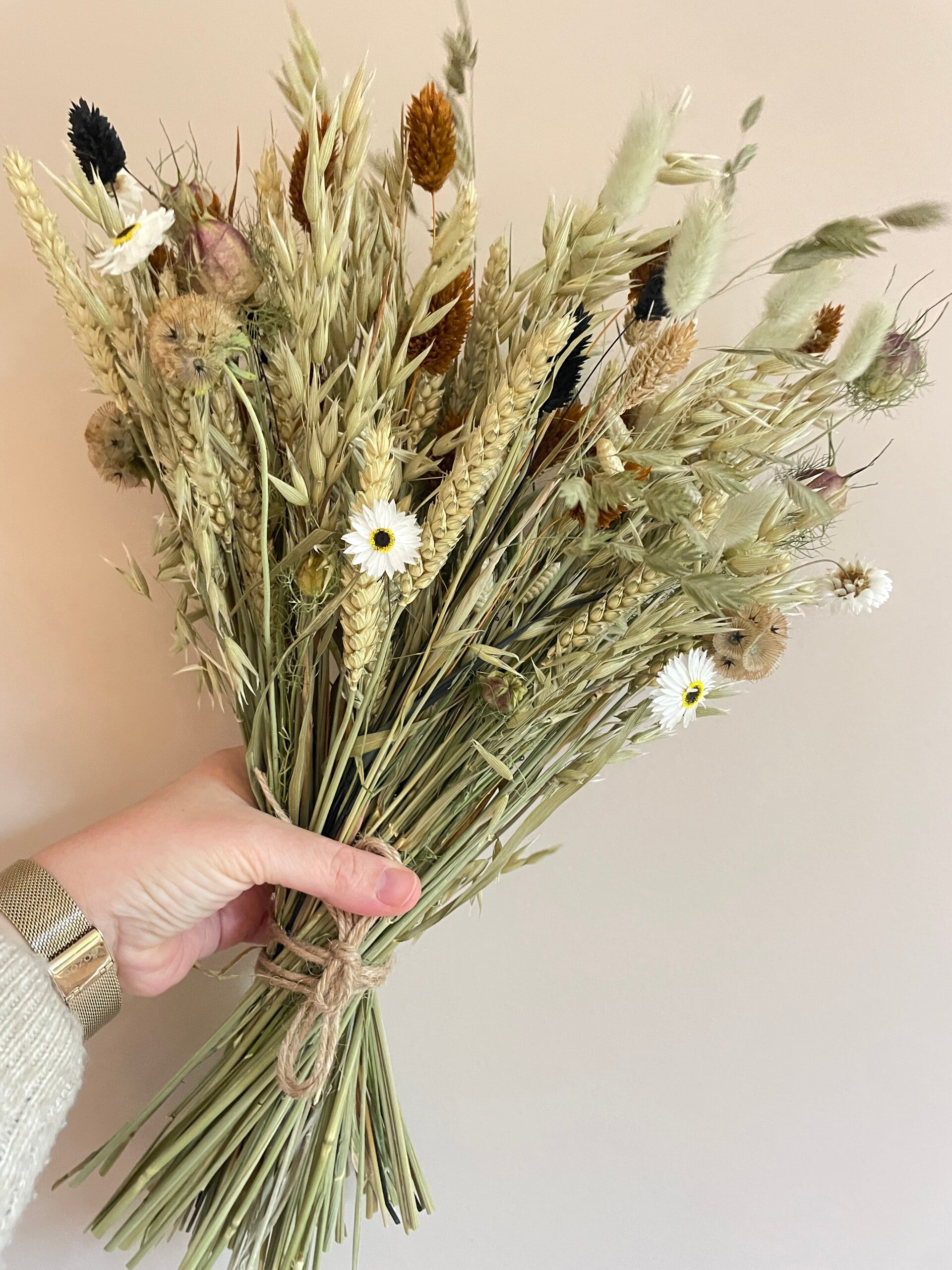 Dit mooie rustige droogboeket staat in alle interieurs! Rustige kleuren droogbloemen waar je veel en lang plezier van heb.