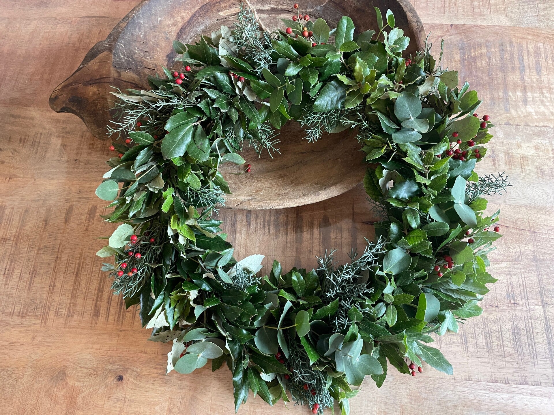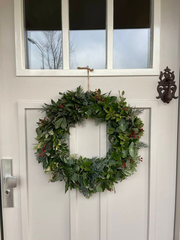 Hij is opgemaakt met verse steeneik, eucalyptus en dennengroen. Evt met rode besjes ( zie keuzemogelijkheid)