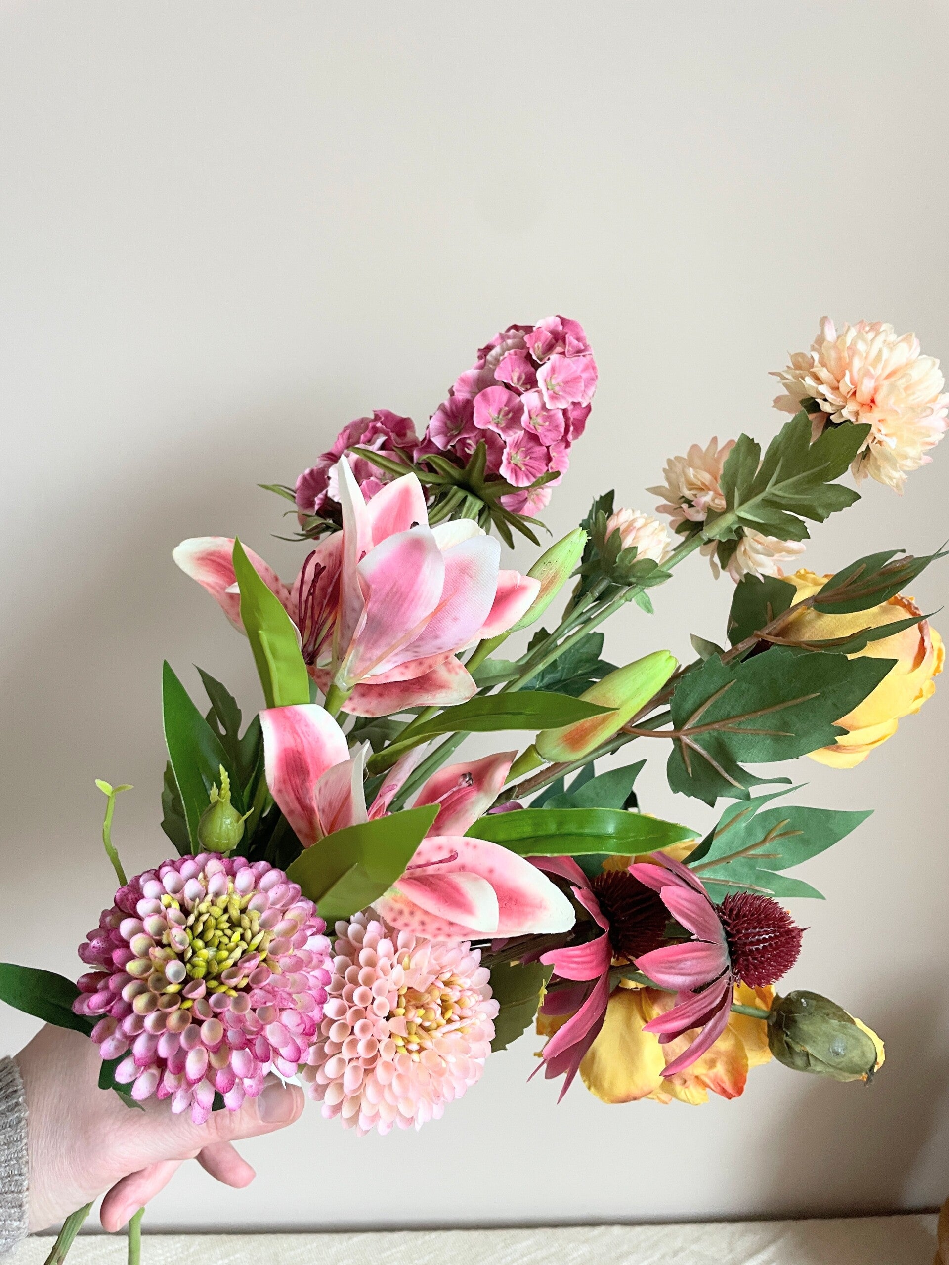 Dit prachtige zijde en kunst boeket bestaat uit 7 verschillende takken.