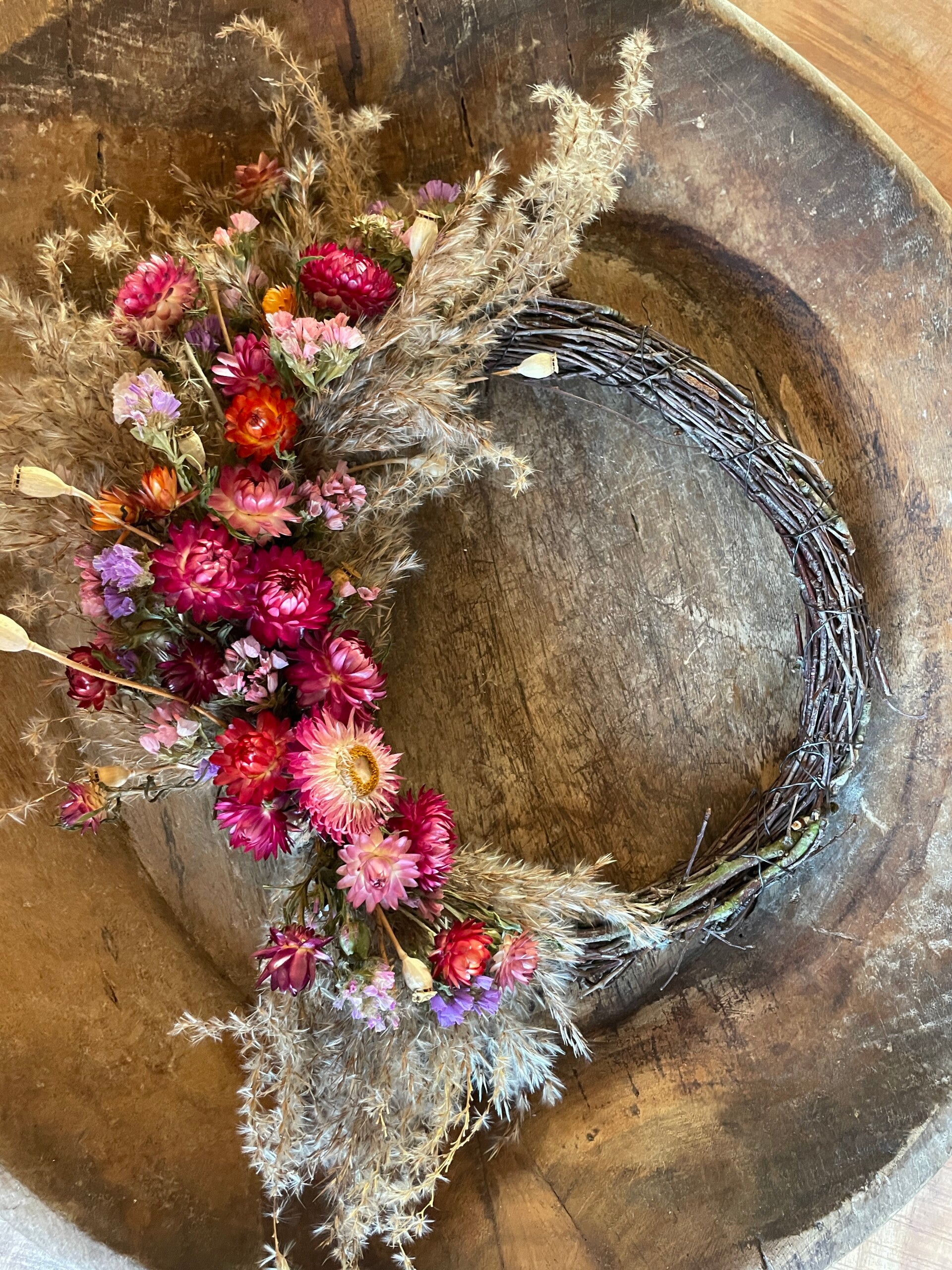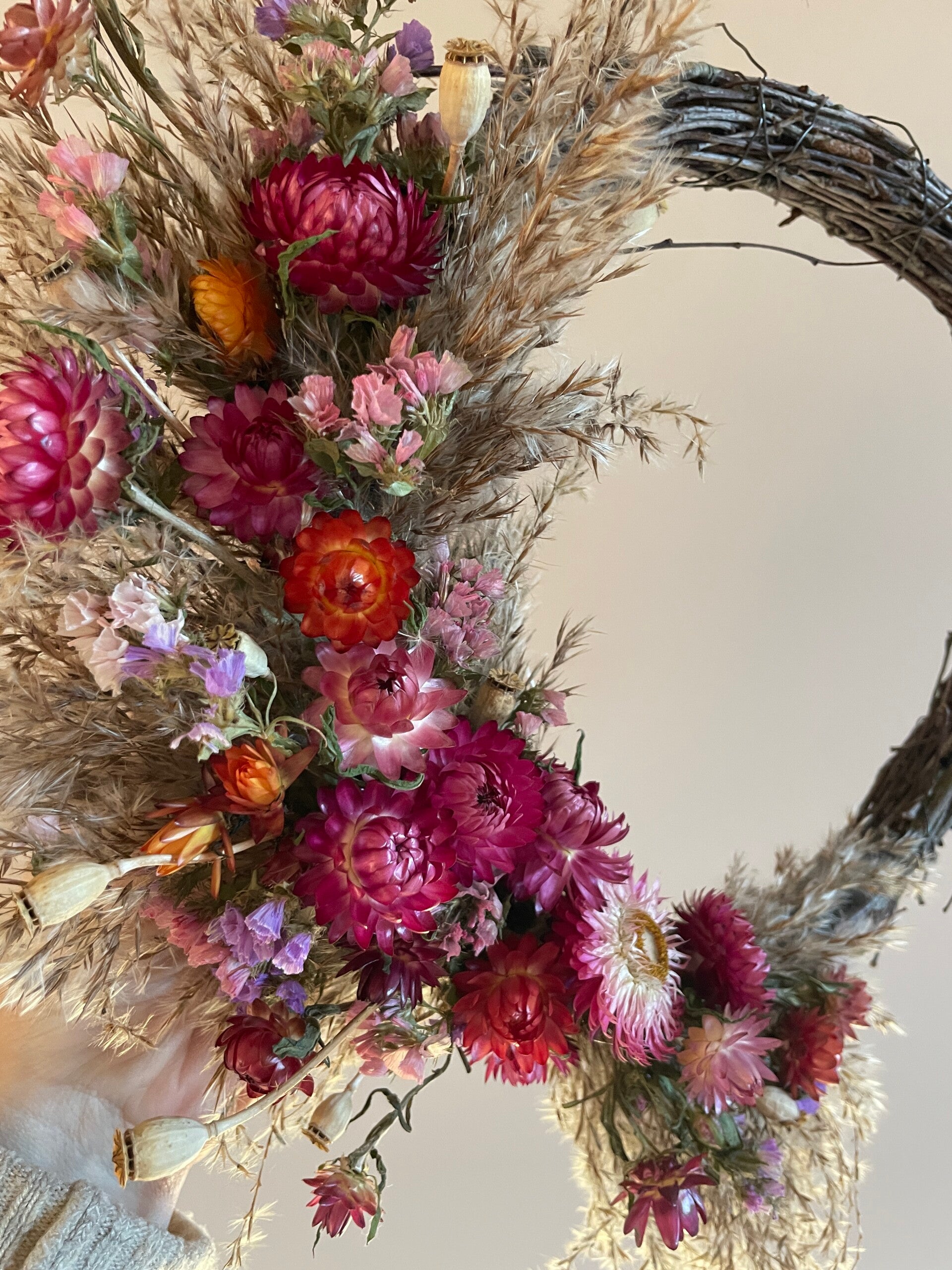 Deze prachtige handgemaakte kransen zijn uniek! De krans zelf is gemaakt van berkentakken van een boom uit eigen tuin. De biologische droogbloemen die zijn met veel liefde gezaaid, geoogst en gedroogd door mijzelf.