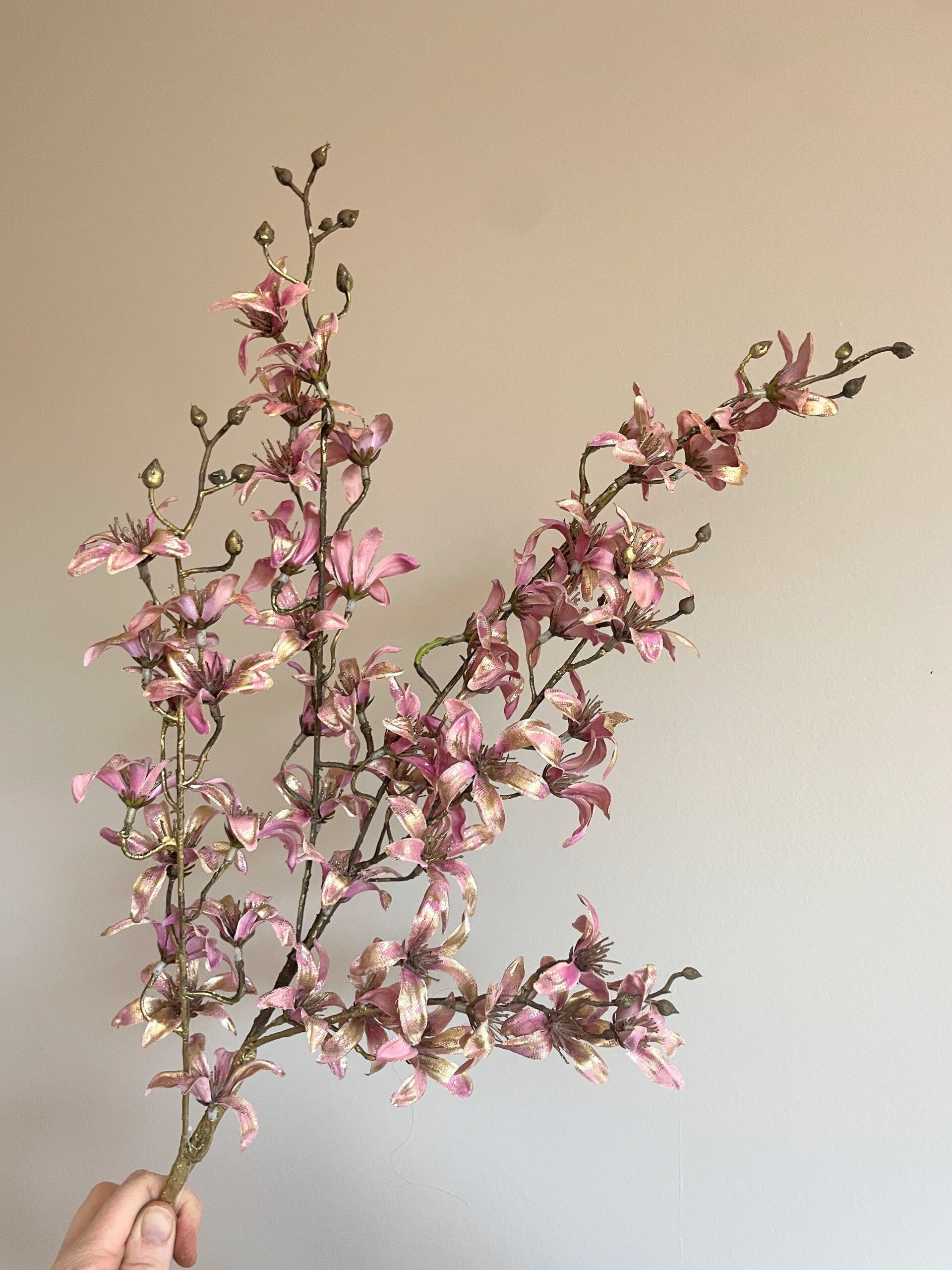 De magnolia tak is met kleinere bloemen. De bloemen hebben een vleugje goud.