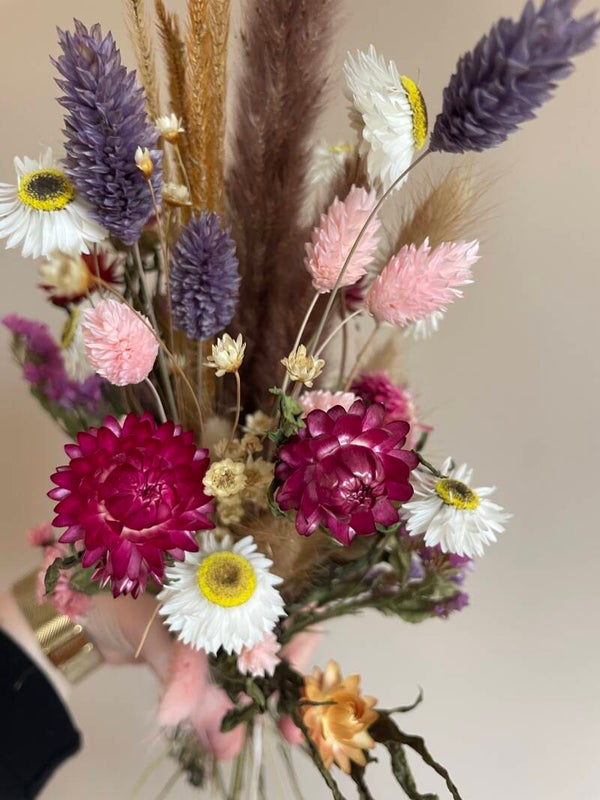 Dit prachtige droogboeket bestaat uit veel droogbloemen die uit eigen pluktuin komen. Ook zijn er aantal geverfde pluimpjes tussen. Het is een mix van kleur dit boeket. Lengte ongeveer 40 cm