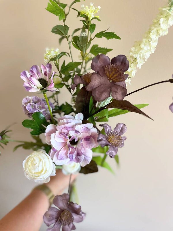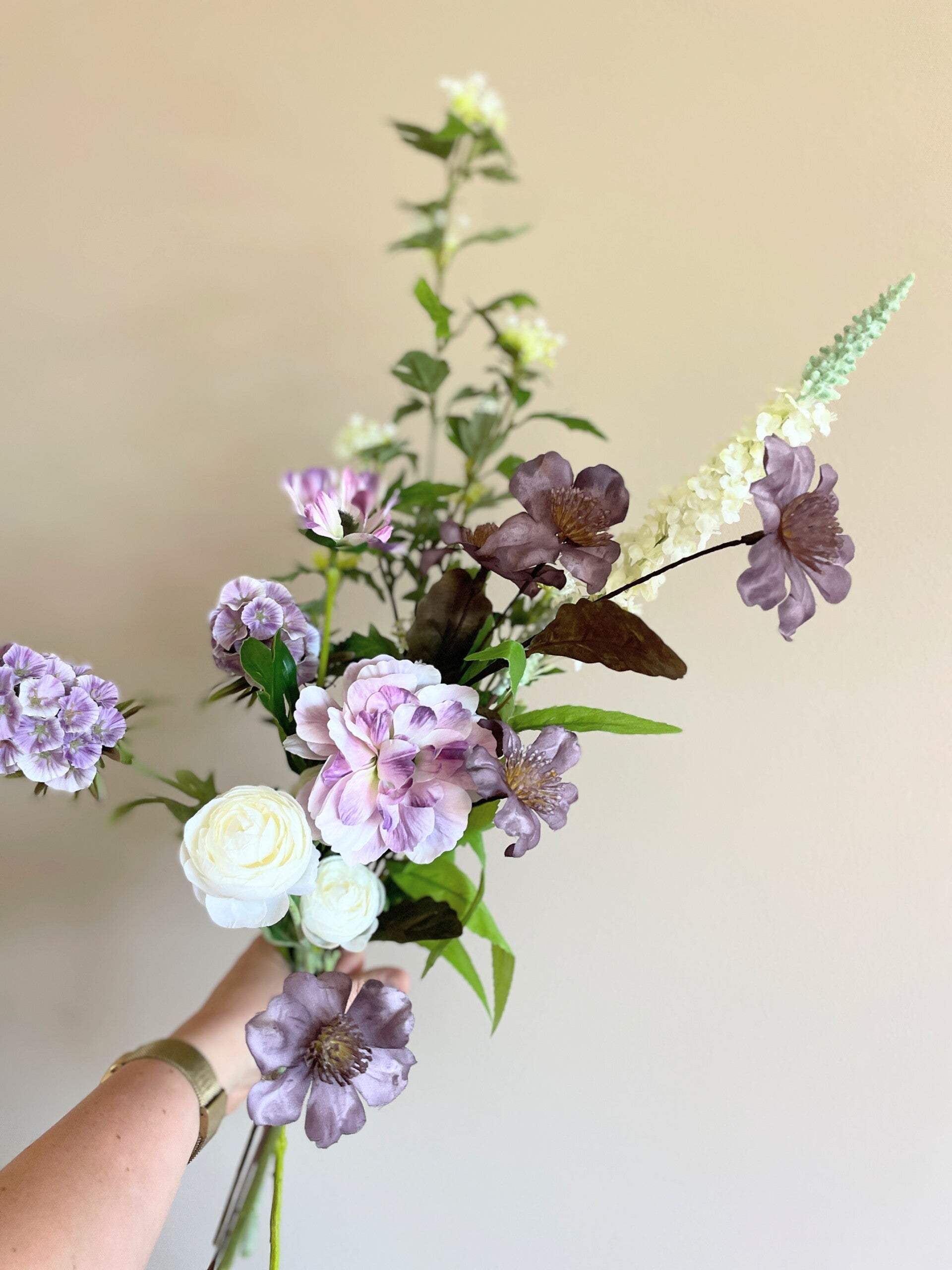 Dit prachtige boeket met paars tinten is een rustig boeket, maar ook echt een blikvanger. Met een paar witte bloemen is het een boeket waar je lang van gaat genieten.