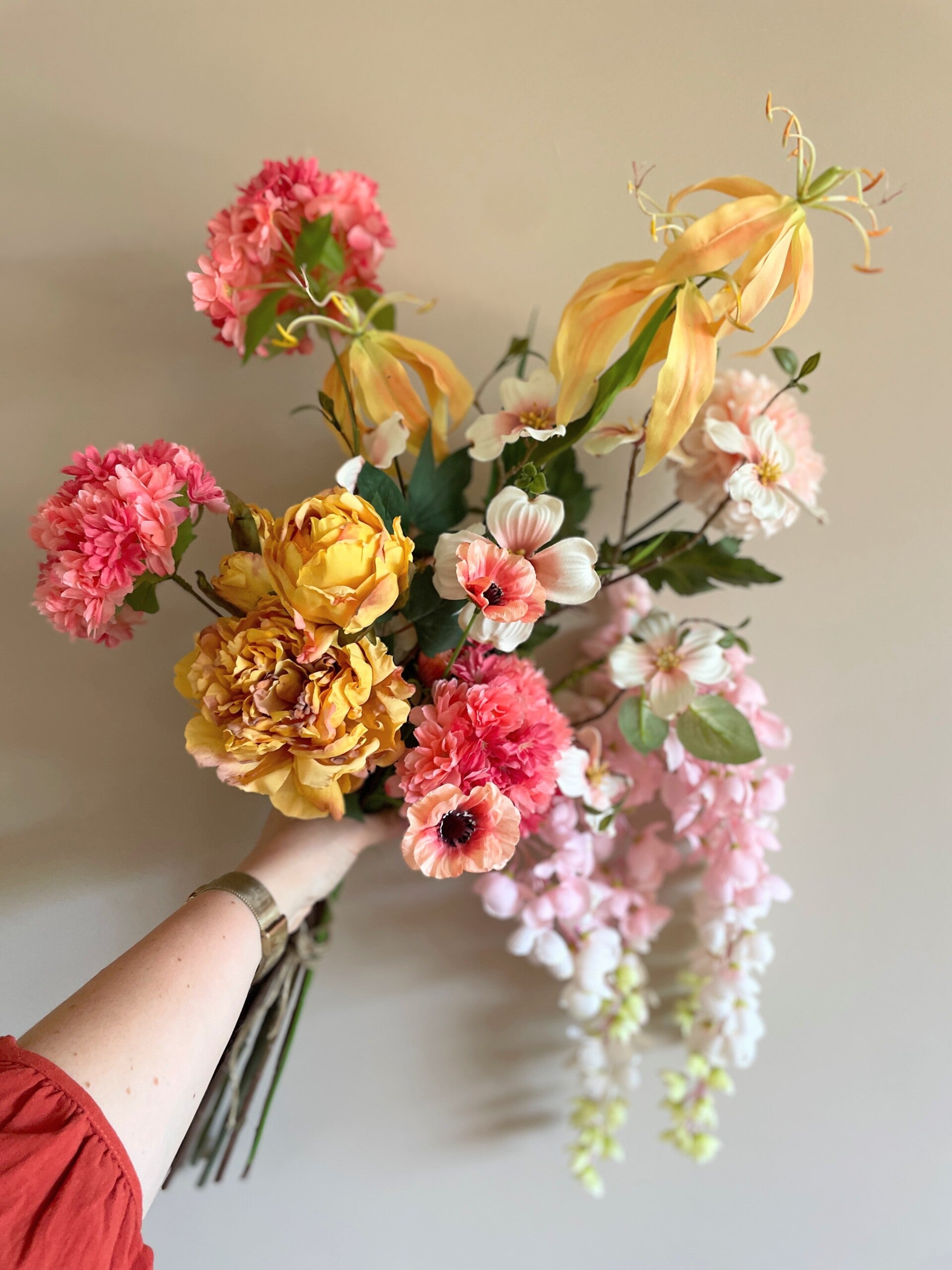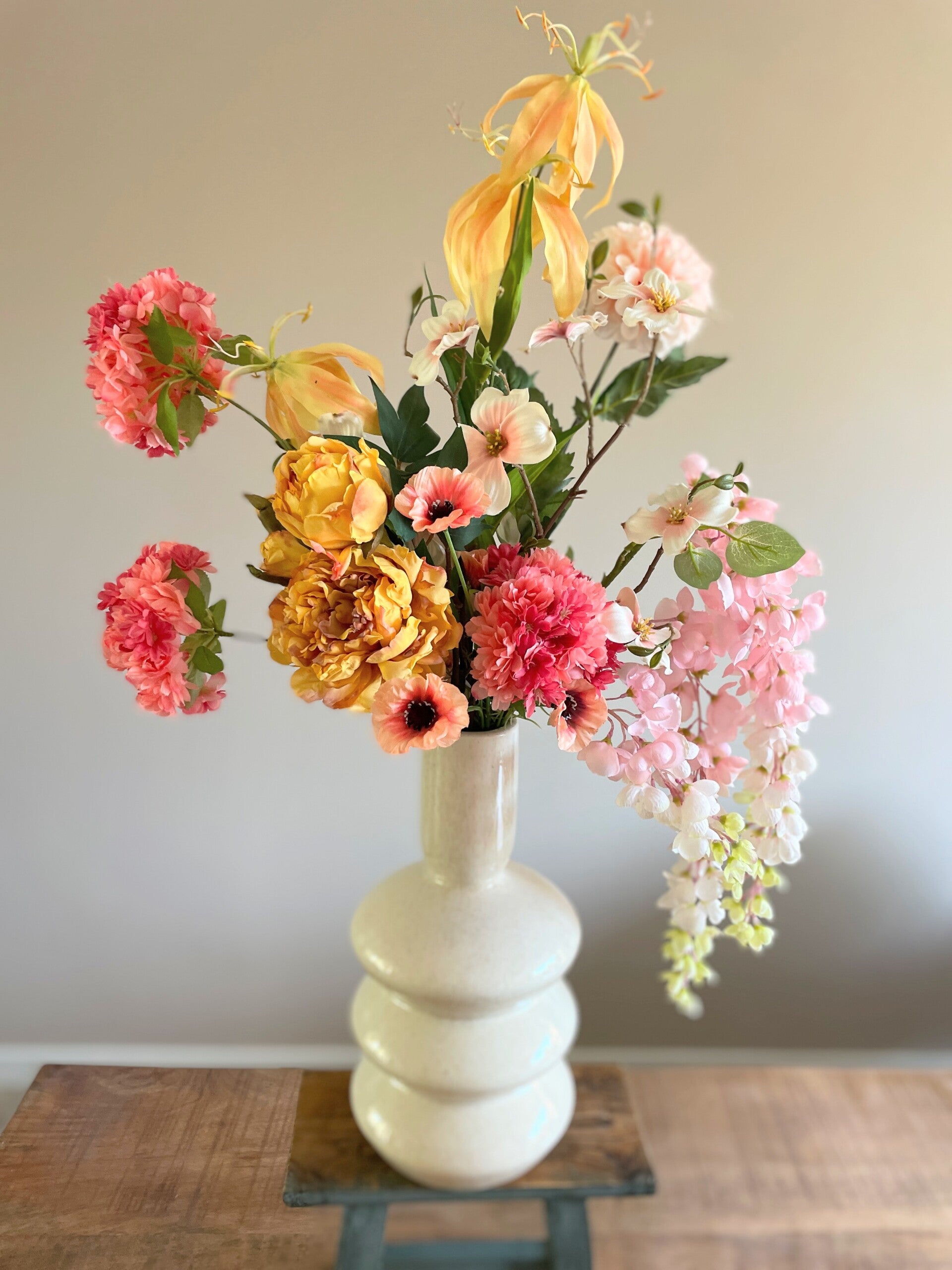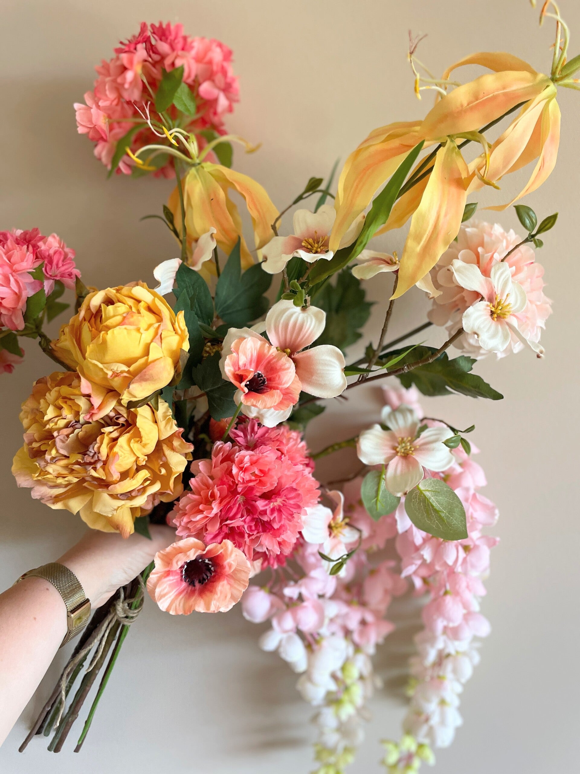 Een vrolijk boeket roze en geel! Deze bloemen zijn zo mooi, ze lijken net echt. Geniet van dit boeket!