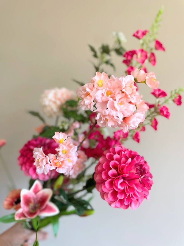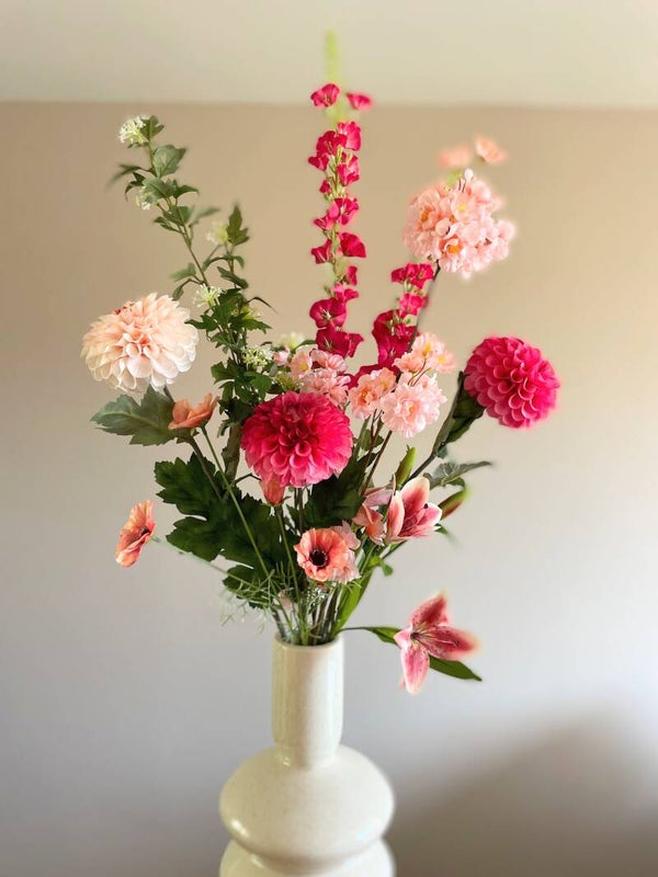 Een prachtig fleurig zijdeboeket. Een vol en fleurig roze boeket. Een duurzame keuze als je kiest voor een Zijdebloemen boeket.