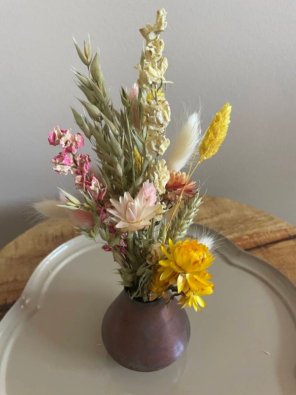 Dit leuke en gezellige mini metalen vaasje is in combinatie met dit droogbloemen boeketje een leuk cadeautje om te geven maar ook om te krijgen