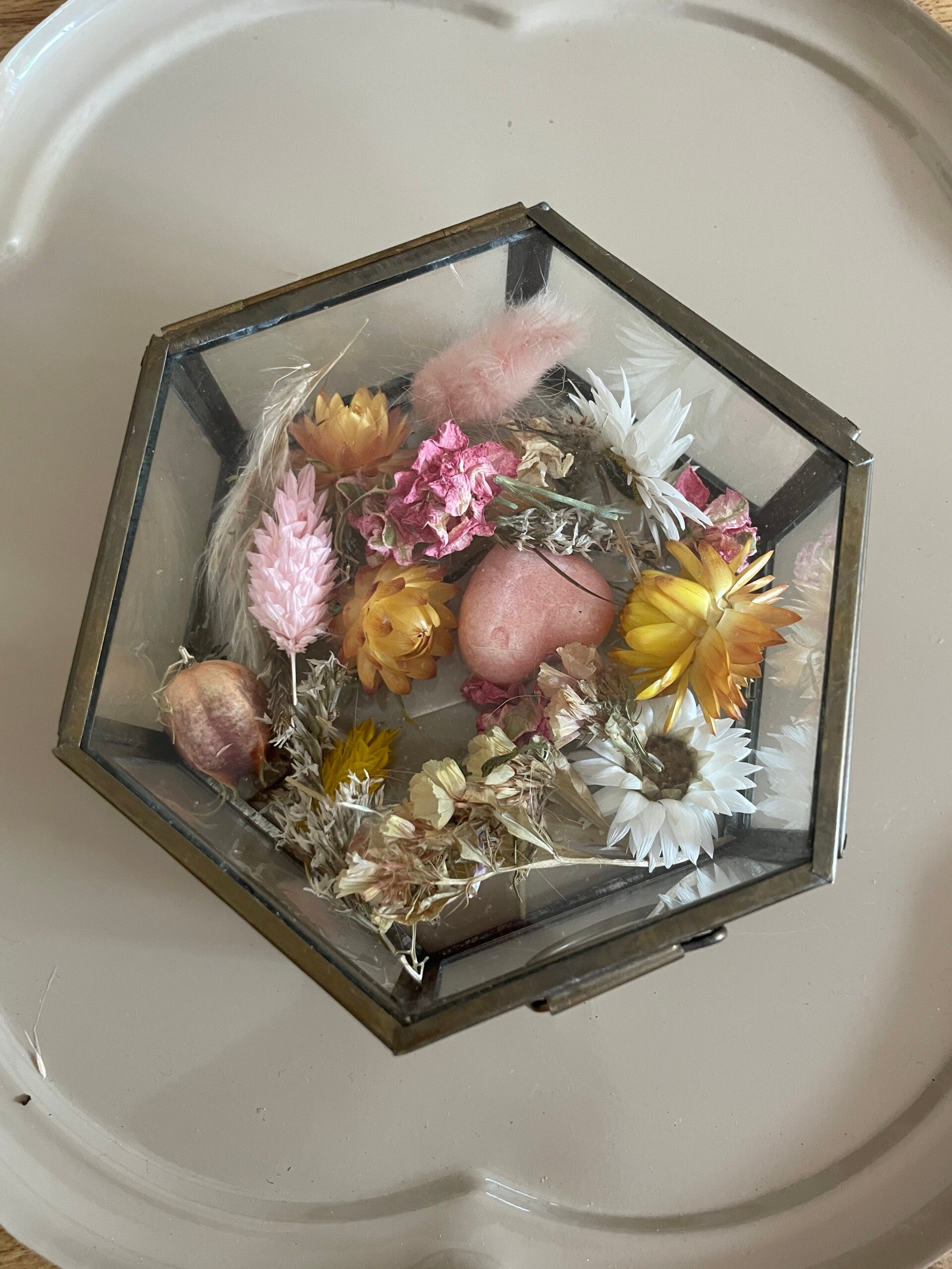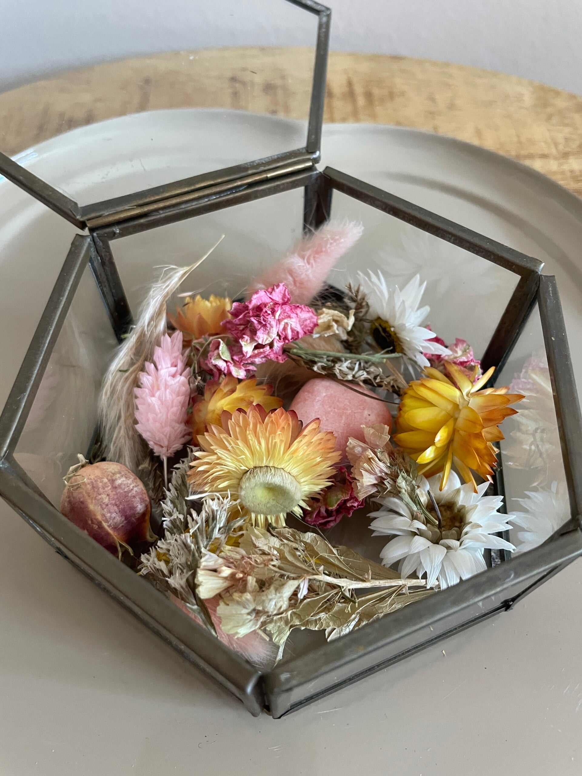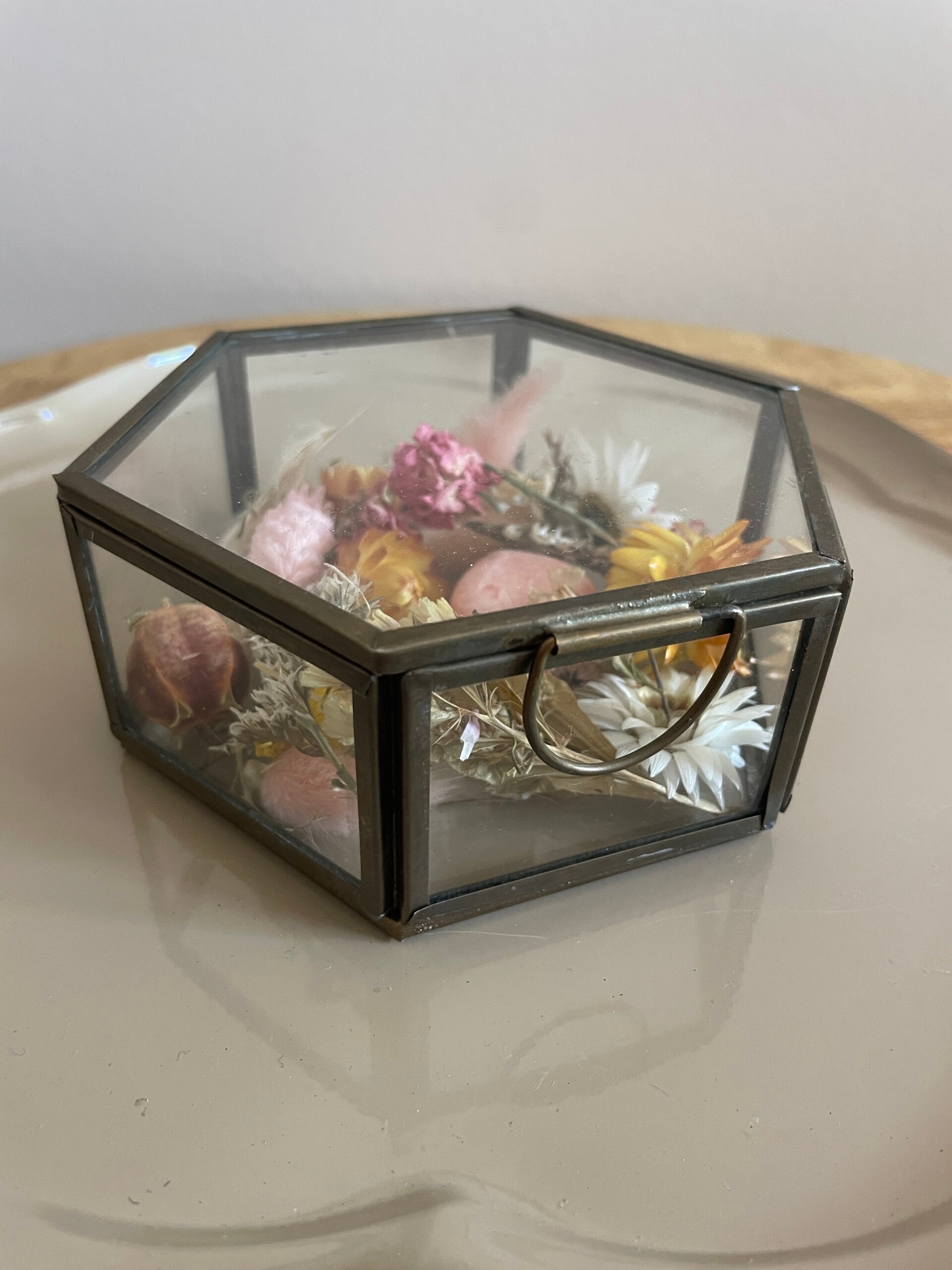Een prachtig glazen bakje met droogbloemen en een mini amberblokje.