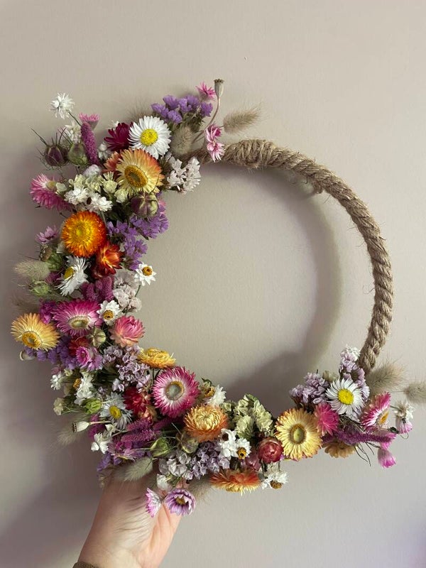 Deze prachtige krans is gemaakt met bloemen uit mijn eigen pluktuin! Zelf gezaaid, geoogst en gedroogd.