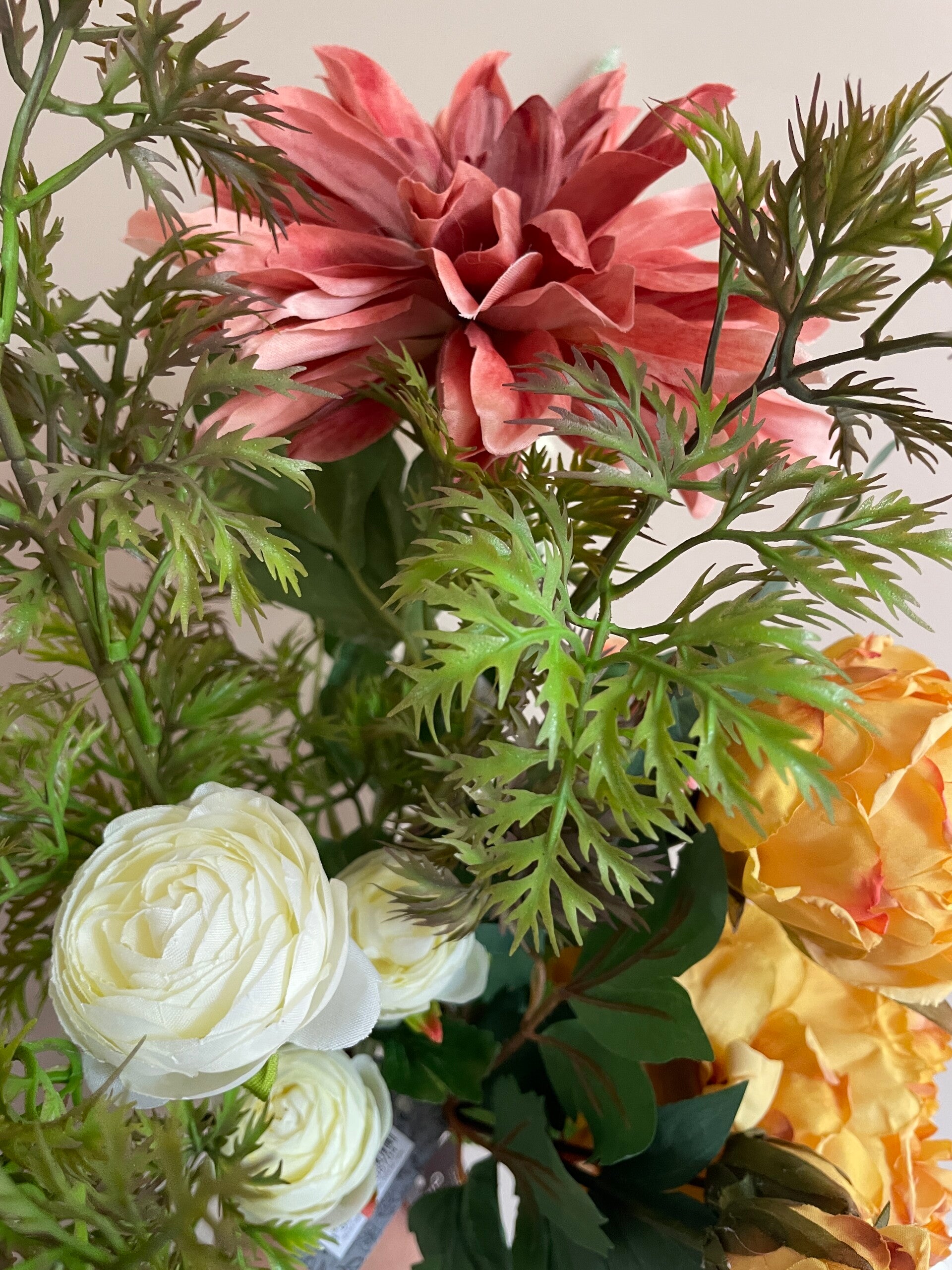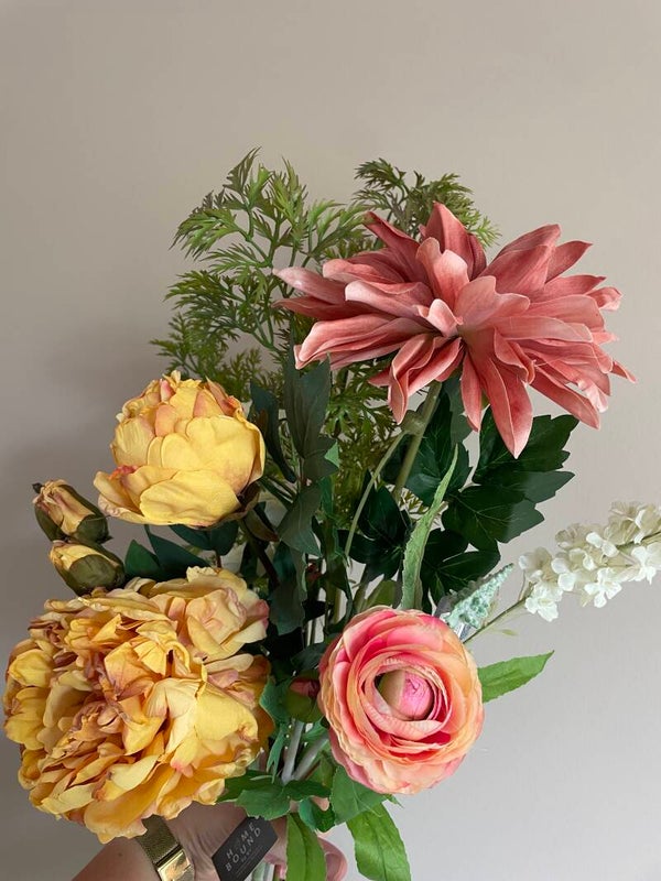 Een boeket met zijde en kunstbloemen waar je heel lang van kunt genieten. Deze kleuren doen je denken aan de late avond zon in de zomer. Prachtige kleuren geel, oranje en roze.