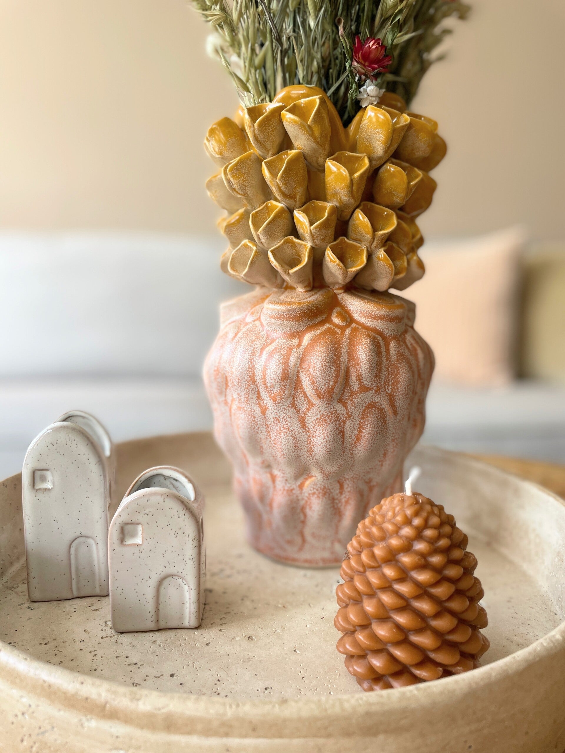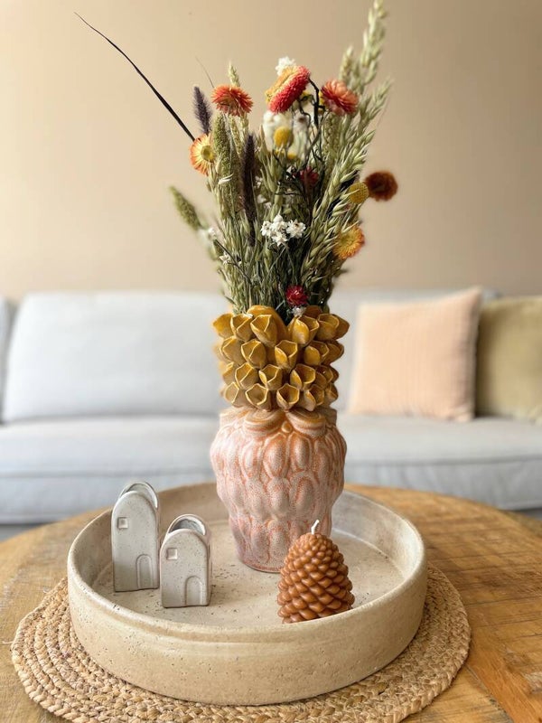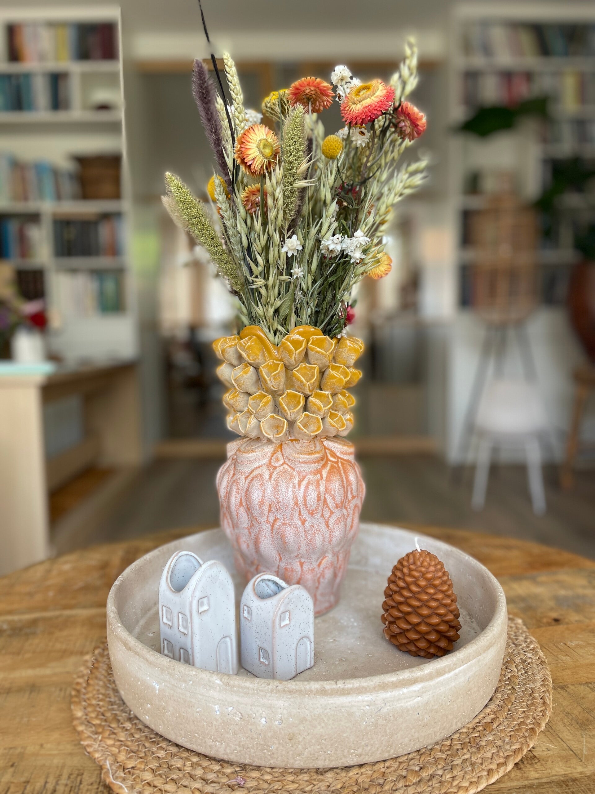 Zet een statement in je interieur met deze opvallende aardewerk vaas! Met zijn rijke textuur, warme aardetinten en weelderige, gele kroon van bloemvormige openingen is dit een vaas die gegarandeerd de aandacht trekt. Met het formaat van 14,5x14,5x26cm is deze vaas ideaal als opvallend decoratiestuk op een dressoir, of vul het met een enkele kunstbloem voor een speels effect.
