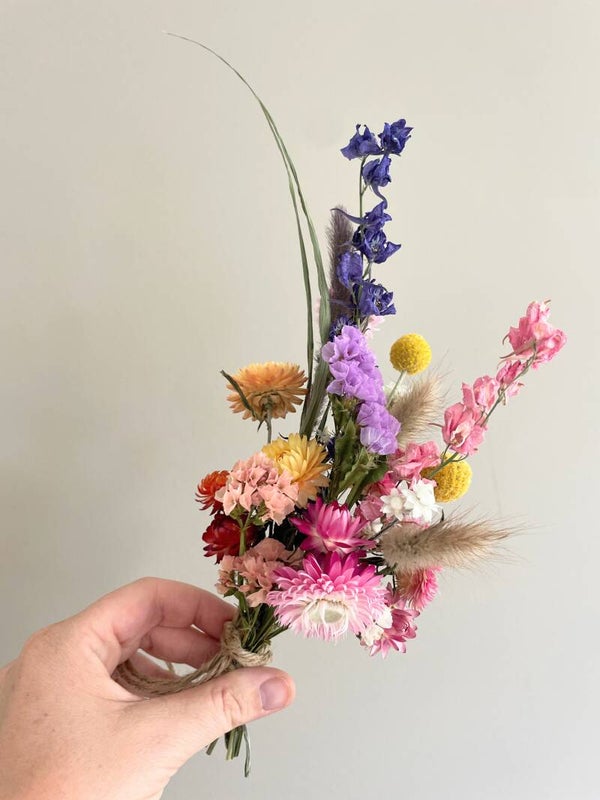 Een lief klein fleurig boeketje met 100% biologische droogbloemen uit eigen pluktuin.
