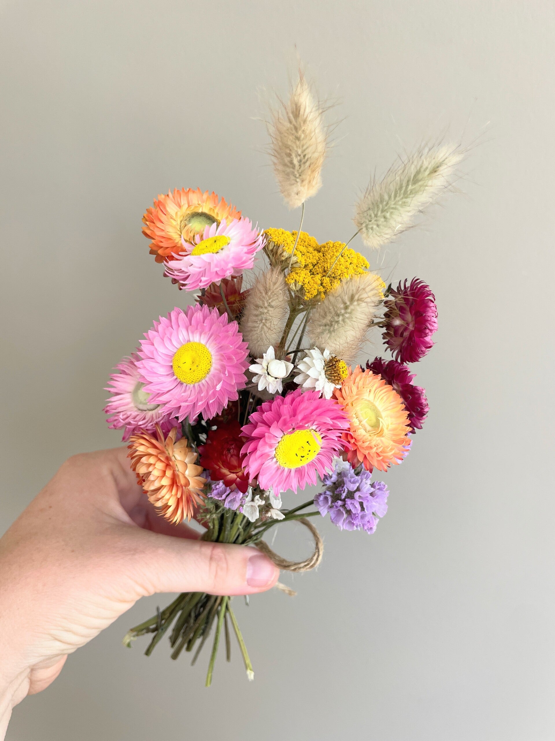 Een lief boeketje met 100% biologische en duurzame droogbloemen uit eigen pluktuin.