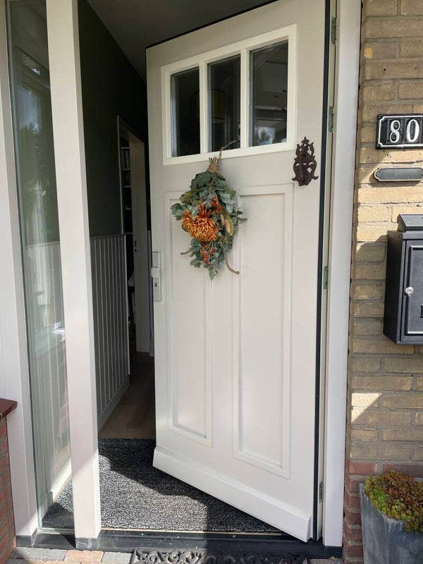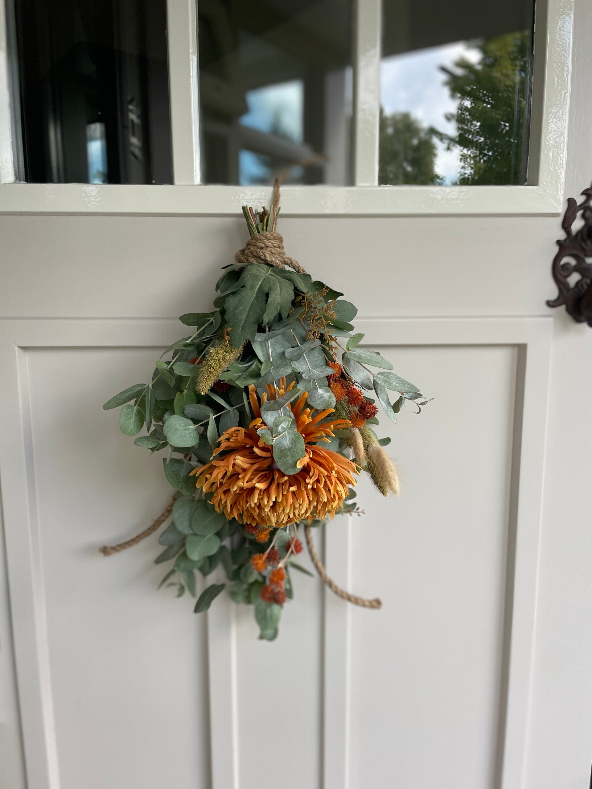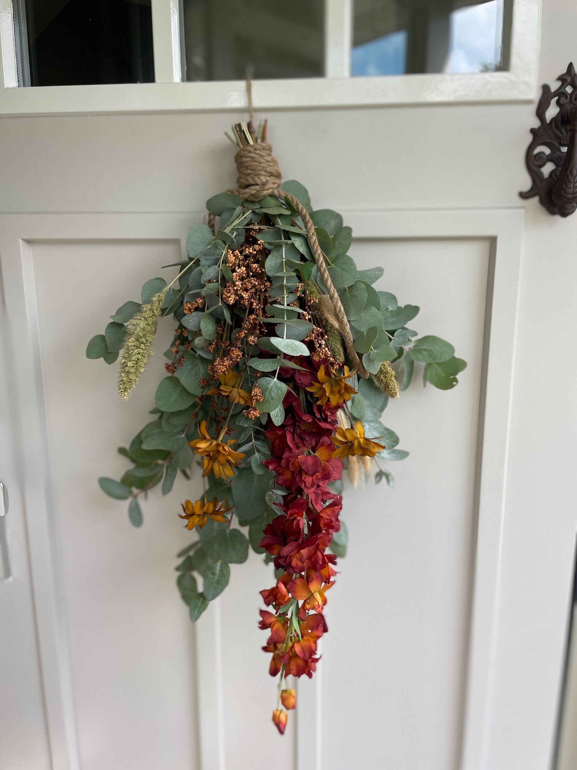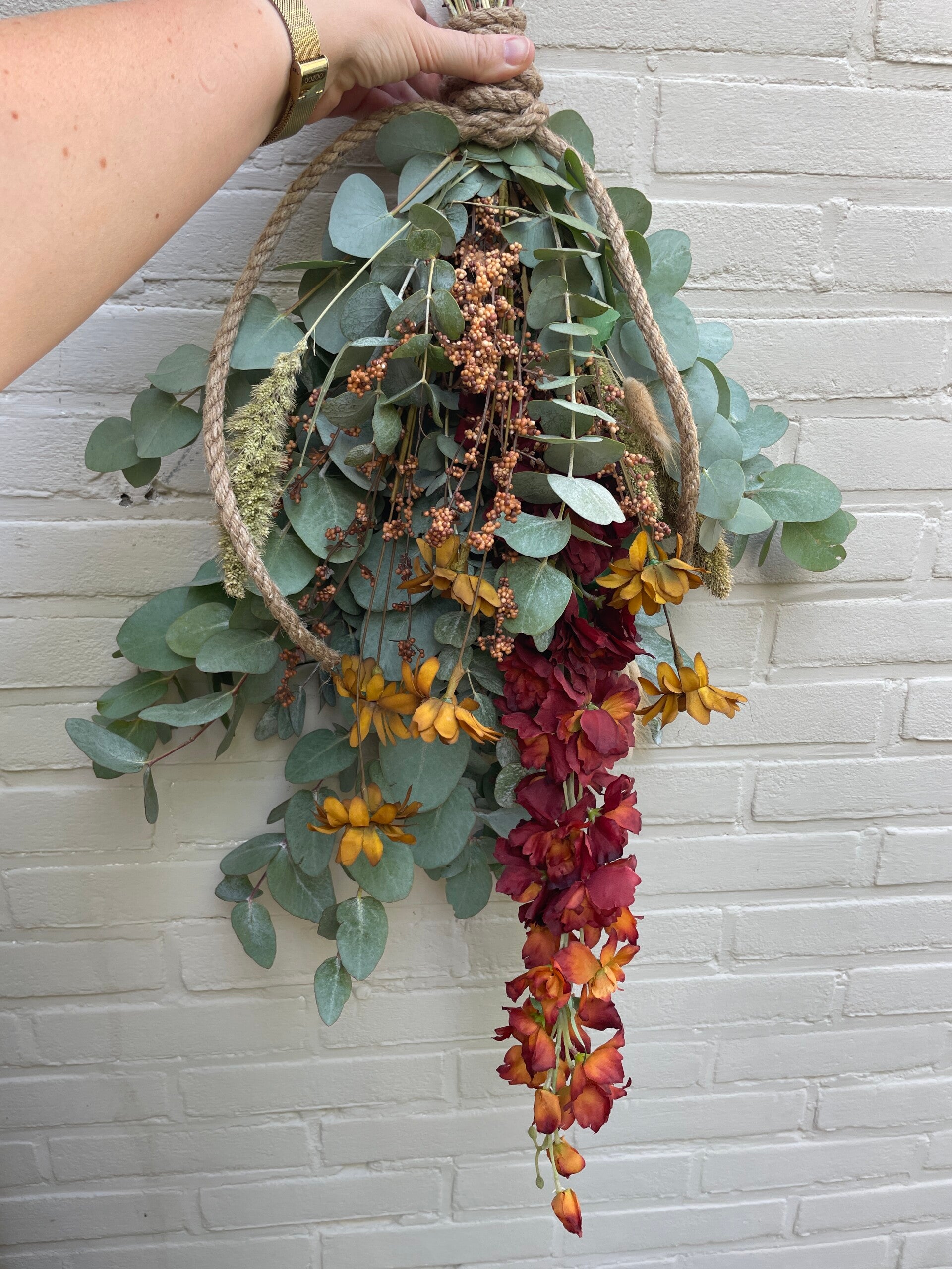 De toef is gemaakt met eucalyptus, droogbloemen en 2 zijde of kunstbloemen.