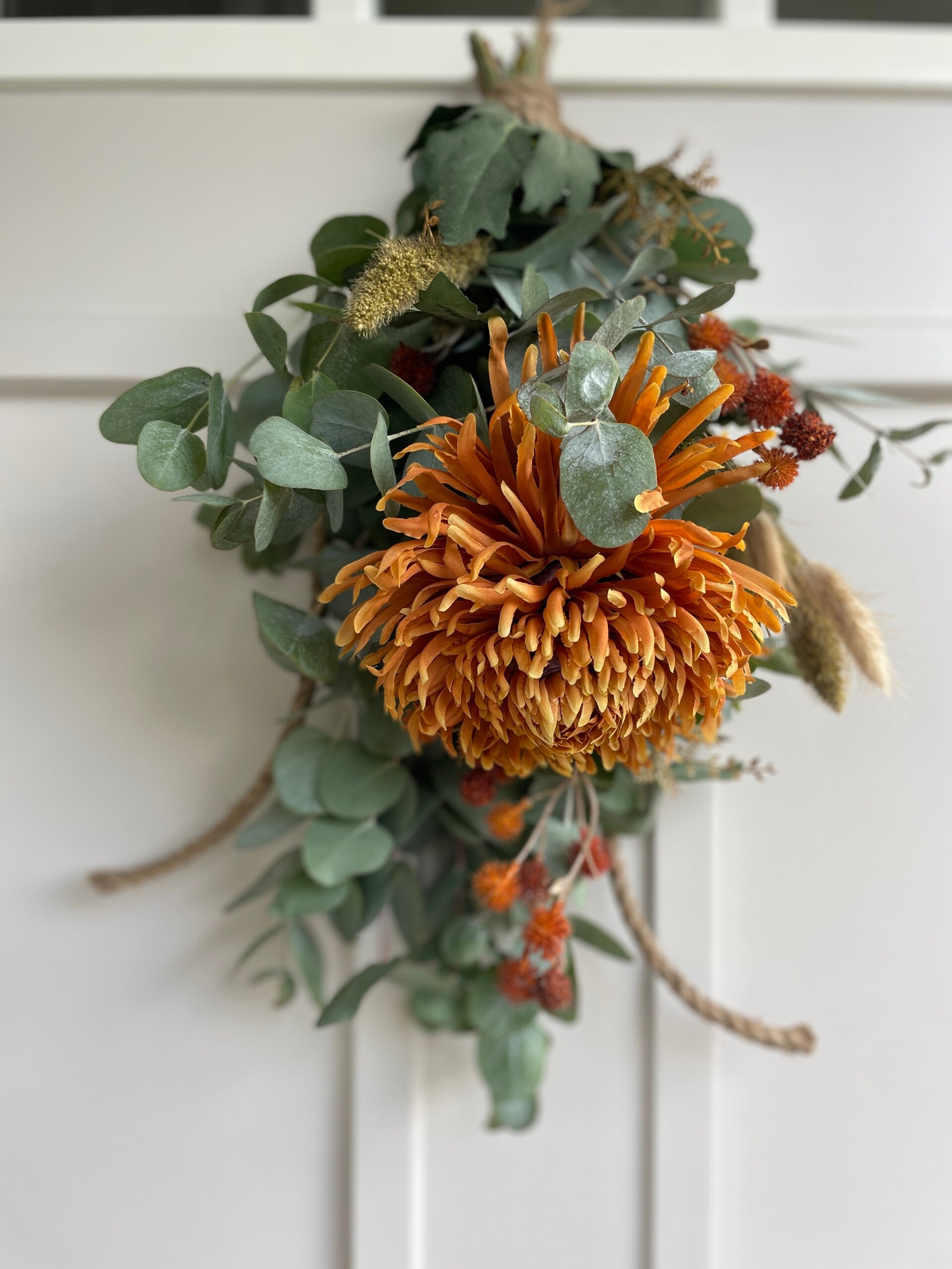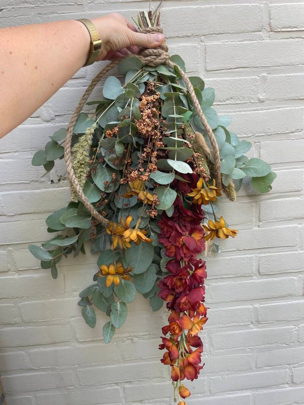De toef is gemaakt met eucalyptus, droogbloemen en 2 zijde of kunstbloemen.