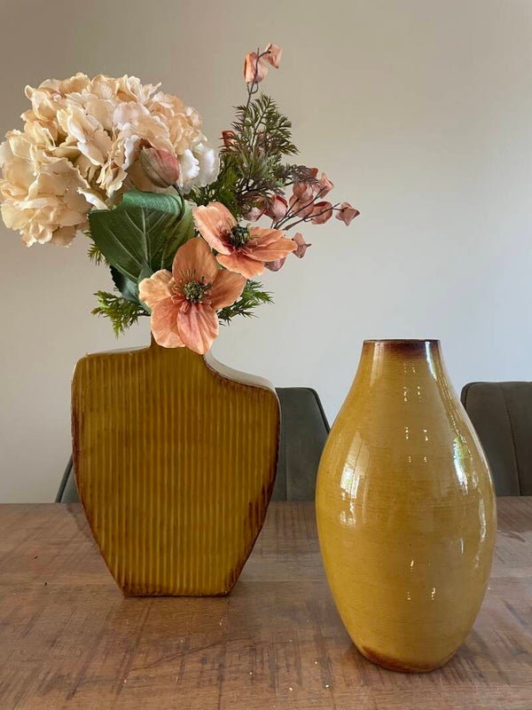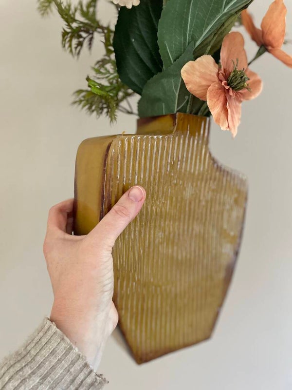 Mooie ribbels op voor en achterkant. Te combineren met de andere vaas cognac. Hoogte:26 cm