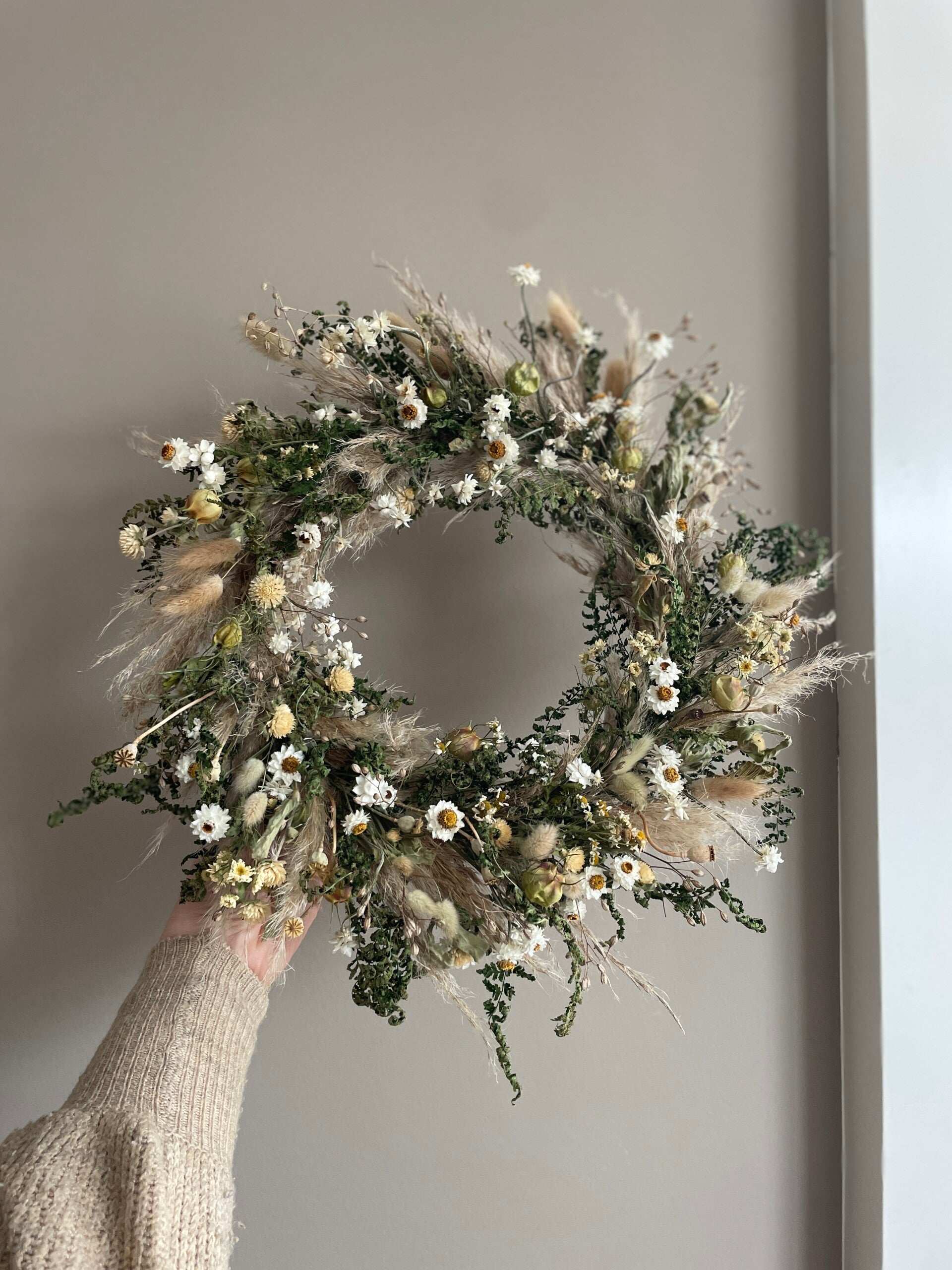 Een prachtige neutrale krans met allemaal biologische en duurzame bloemen uit eigen tuin of eigen omgeving. Een krans waar je heel lang plezier van hebt!