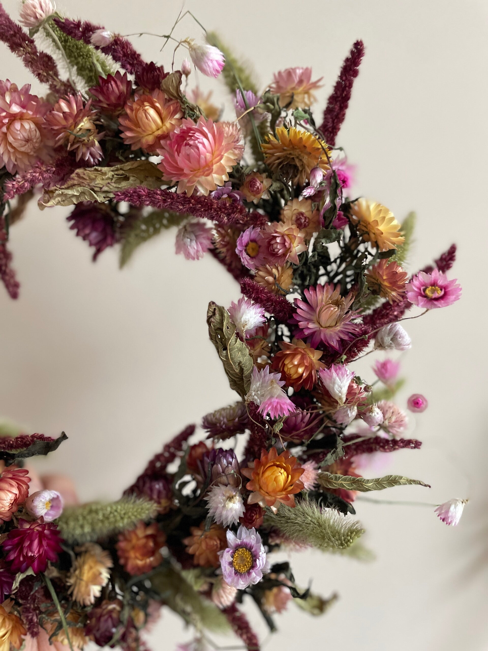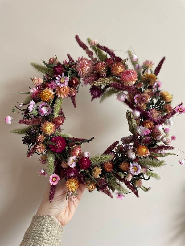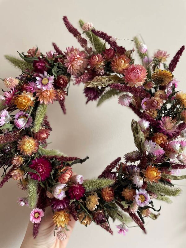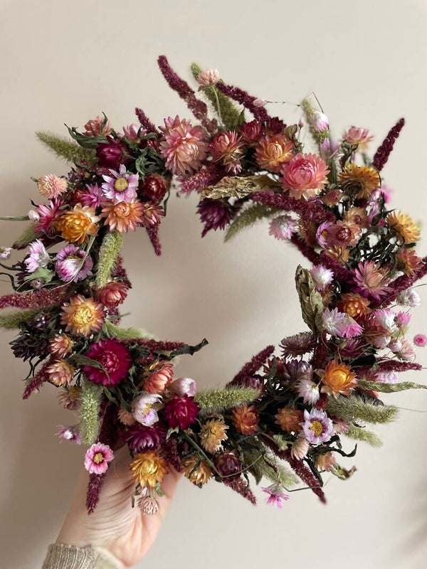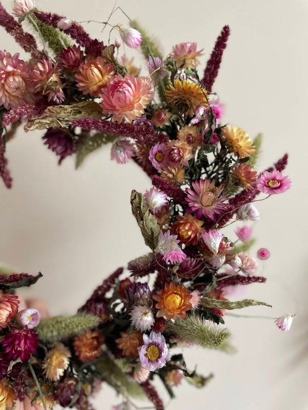 Een prachtige krans met warme kleuren. Bijna de hele krans is met droogbloemen uit eigen pluktuin. Een duurzame en biologische keuze waar je lang plezier van heb!