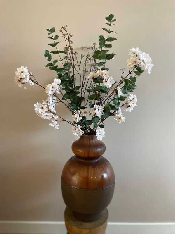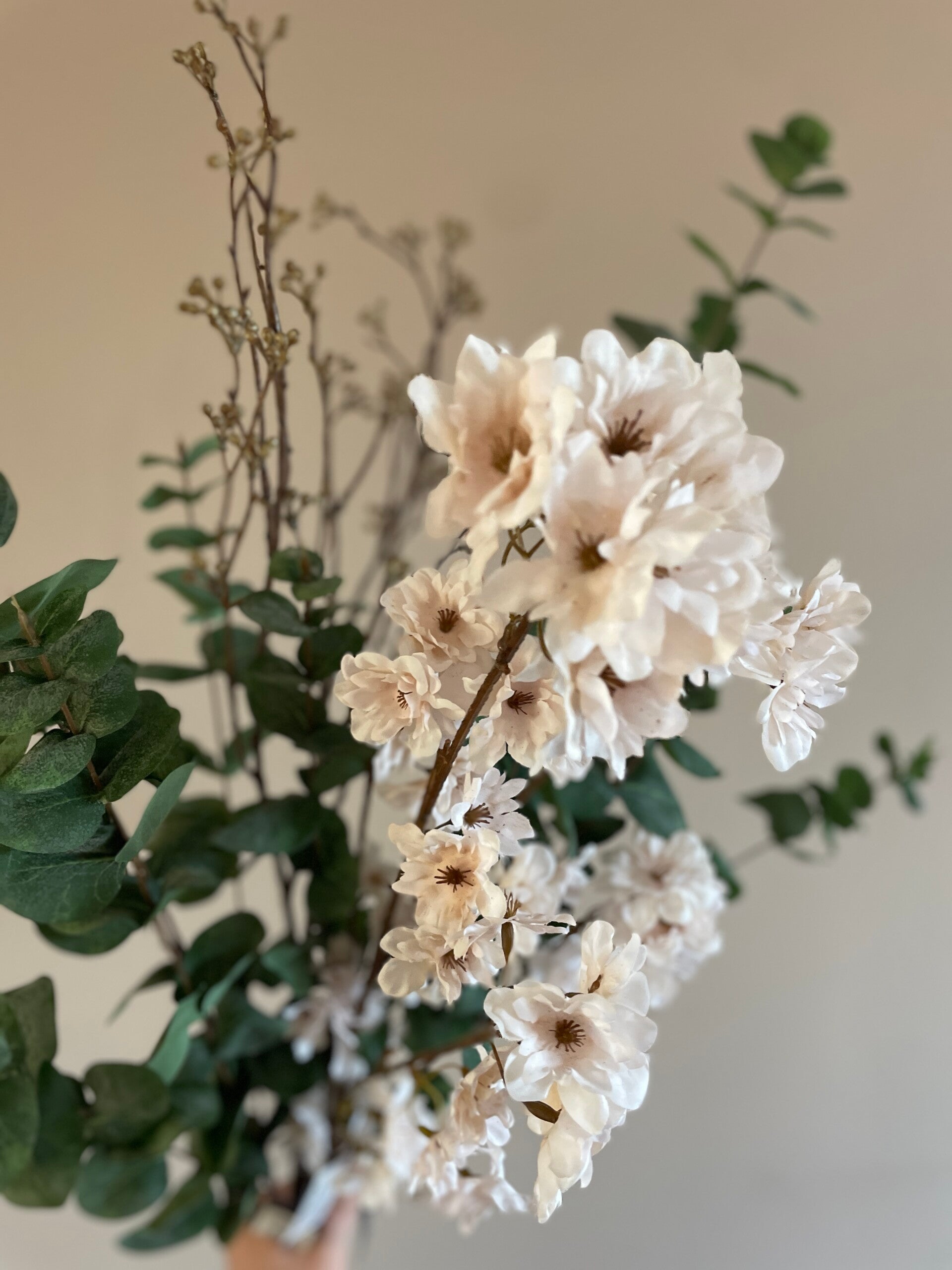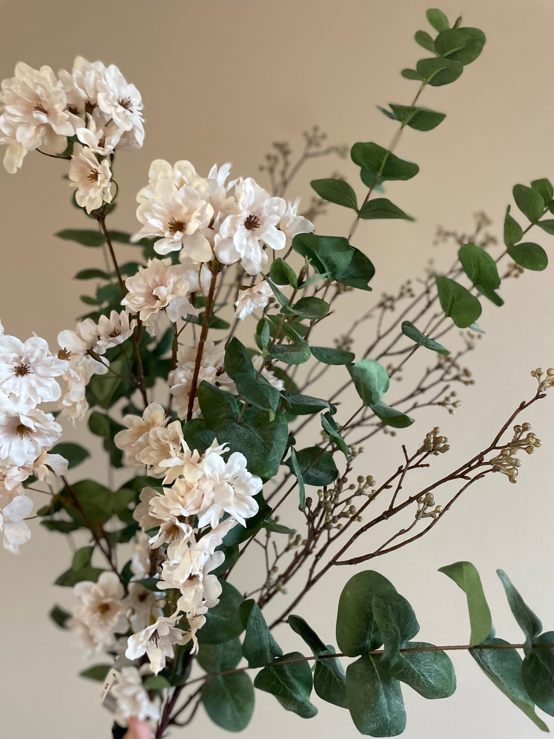 Een prachtig boeket met kunst en zijde takken. Bloesems en besjes met eucalyptus.
