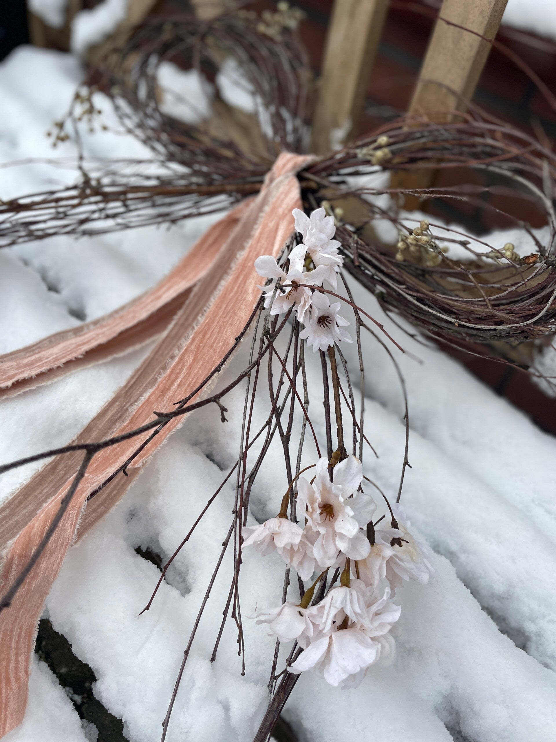 Uniek en creatief item deze strik gemaakt van berkentakken en zijde en kunstbloemen. Afgestript met prachtige velvet linten.