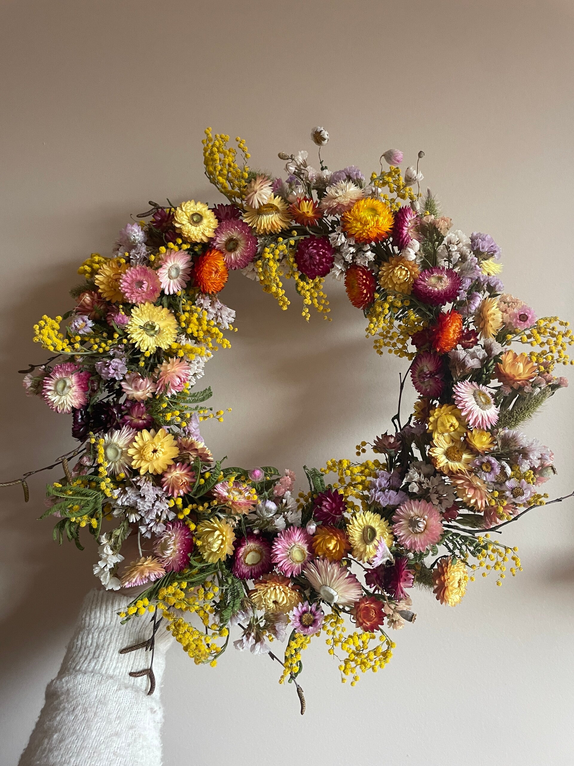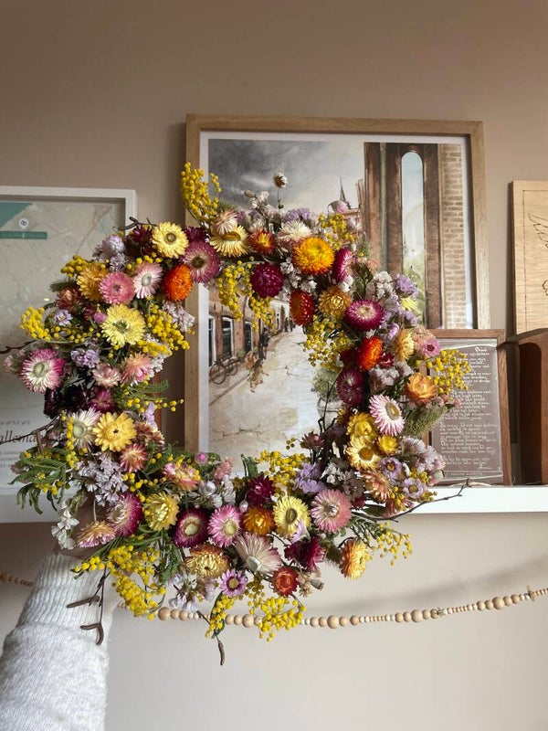 Een prachtige vrolijke voorjaarskrans! De krans is opgemaakt met vooral strobloemen in verschillende kleuren. Deze bloemen helychrisum behouden lang hun originele kleur. De krans is bijna helemaal gemaakt met bloemen uit eigen pluktuin!