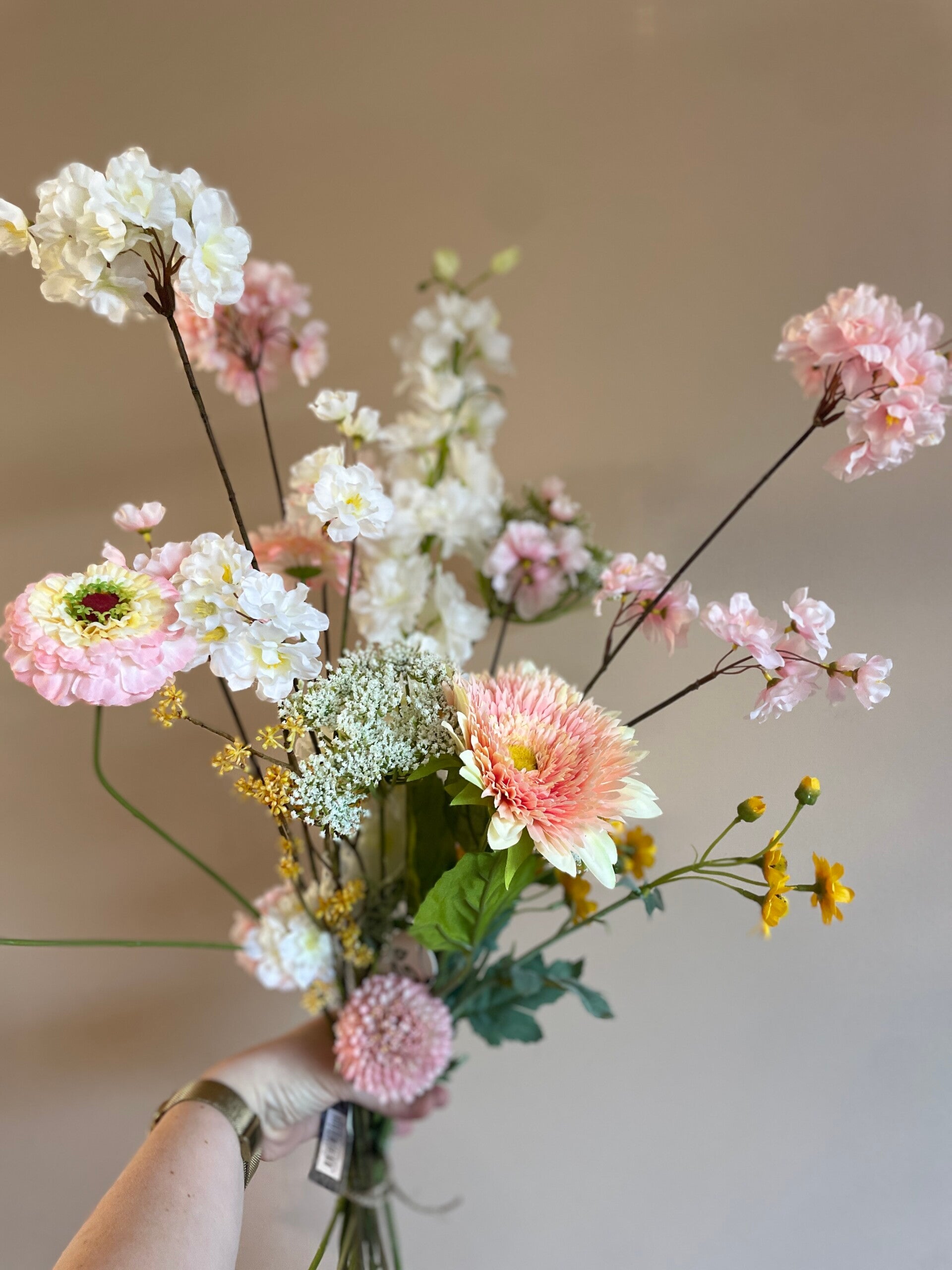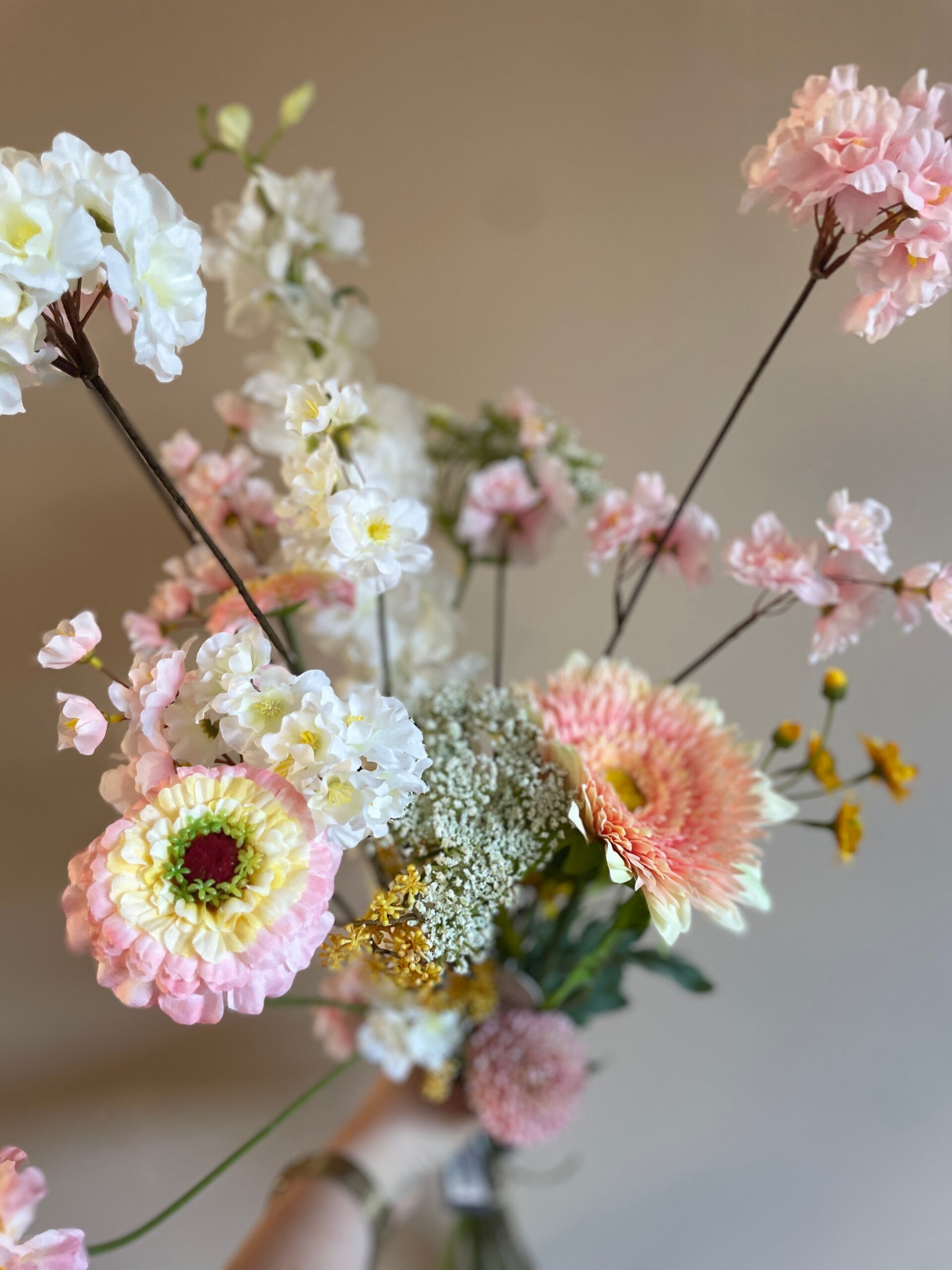 Een heerlijk fris boeket met blije kleuren. De roze, witte en gele tinten zijn een feestje op de vaas.